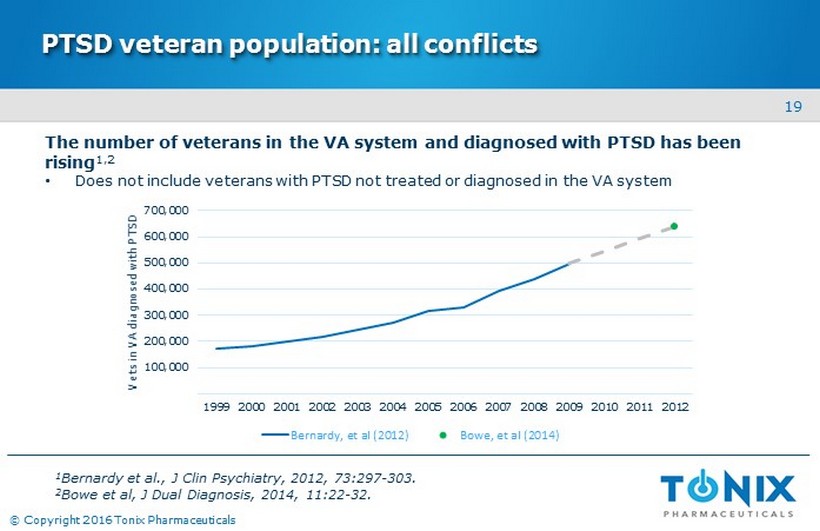 18 © Copyright 2016 Tonix Pharmaceuticals PTSD veteran population: recent conflicts only Veteran Administration (VA) records indicate that 20% of veterans from recent conflicts will have potential or provisional PTSD Source: Report on VA Facility Specific Operation Enduring Freedom (OEF), Operation Iraqi Freedom (OIF), and Operation New Dawn (OND) Veterans Diagnosed with Potential or Provisional PTSD. Cumulative from 1 st Qtr FY 2002 through 1 st Qtr FY 2014 (October 1, 2001 – March 31, 2014 ). 1,781,000 350,898 0 200,000 400,000 600,000 800,000 1,000,000 1,200,000 1,400,000 1,600,000 1,800,000 2,000,000 Veterans of Recent Conflicts PTSD Veterans Involved in Recent Conflicts Veterans From Recent Conflicts