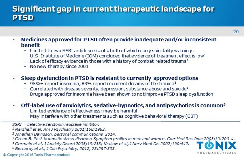 19 © Copyright 2016 Tonix Pharmaceuticals PTSD veteran population: all conflicts 1 Bernardy et al., J Clin Psychiatry, 2012, 73:297 - 303. 2 Bowe et al, J Dual Diagnosis, 2014, 11:22 - 32. The number of veterans in the VA system and diagnosed with PTSD has been rising 1,2 • Does not include veterans with PTSD not treated or diagnosed in the VA system 100,000 200,000 300,000 400,000 500,000 600,000 700,000 1999 2000 2001 2002 2003 2004 2005 2006 2007 2008 2009 2010 2011 2012 Vets in VA diagnosed with PTSD Bernardy, et al (2012) Bowe, et al (2014)