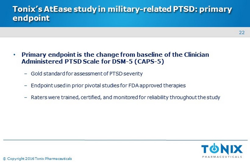 21 © Copyright 2016 Tonix Pharmaceuticals Targeting sleep quality is a novel mechanism of action in PTSD therapy • PTSD patients complain of sleep disturbance as a core symptom 1 ‒ Distressing dreams (nightmares) are part of “re - experiencing” ‒ Avoidance can be of bed/sleep due to fear of nightmares ‒ Restless sleep is part of the “hyper - arousal” cluster of PTSD diagnostic criteria • Sleep disturbance after trauma is linked to onset of PTSD 2 • Sleep disturbance also correlates with depression, substance abuse and suicidal behaviors in PTSD 3 • TNX - 102 SL is a tricyclic molecule that potently targets three molecular mechanisms 4 , each of which is associated with treating aspects of disturbed sleep, enhancing sleep quality ‒ Blocks the 5 - HT 2A receptor (like trazodone ) ‒ Blocks the α 1 adrenergic receptor (like prazosin ) ‒ Blocks the H 1 receptor (like low - dose doxepin) 1 American Psychiatric Association: Diagnostic and Statistical Manual of Mental Disorders, Fifth Edition, 2013. 2 Koren et al, AJP 159:855 - 857, 2002; Mellman et al, AJP 159:1969 - 1701, 2002. 3 Germain , AJP 170:372 - 382, 2013; McHugh et al, J Traumatic Stress 27:82 - 89, 2014 Betts et al, Journal of Anxiety Disorders 27:735 - 41, 2013. 4 Daugherty et al, Society of Biological Psychiatry 70 th Annual Scientific Convention, May 14 - 16, 2015 Toronto, Ontario, Canada. T NX - 102 SL (cyclobenzaprine HCl sublingual tablets, 2.8 mg) is an Investigational New Drug and is not approved for any indication.