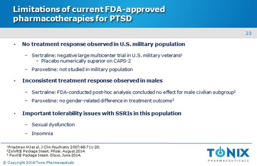 23 © Copyright 2016 Tonix Pharmaceuticals Limitations of current FDA - approved pharmacotherapies for PTSD • No treatment response observed in U.S. military population ‒ Sertraline: negative large multicenter trial in U.S. military veterans 1 ‒ Placebo numerically superior on CAPS - 2 ‒ Paroxetine: not studied in military population • Inconsistent treatment response observed in males ‒ Sertraline: FDA - conducted post - hoc analysis concluded no effect for male civilian subgroup 2 ‒ Paroxetine: no gender - related difference in treatment outcome 3 • Important tolerability issues with SSRIs in this population ‒ Sexual dysfunction ‒ Insomnia 1 Friedman MJ et al. J Clin Psychiatry 2007;68:711 - 20. 2 Zoloft ® Package Insert, Pfizer , August 2014. 3 Paxil® P ackage Insert, Glaxo, June 2014.