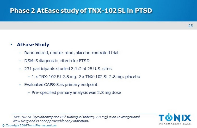 24 © Copyright 2016 Tonix Pharmaceuticals Phase 2 AtEase trial of TNX - 102 SL in PTSD • Randomized, double - blind, placebo - controlled trial in military - related PTSD • Analysis from 231 patients; 24 U.S. clinical sites • Primary efficacy endpoint: ‒ Difference in Clinician - Administered PTSD Scale (CAPS) score between TNX - 102 SL 2.8 mg and placebo at week 12 TNX - 102 SL (cyclobenzaprine HCl sublingual tablets, 2.8 mg) is an Investigational New Drug and is not approved for any indication. TNX - 102 SL was active at 5.6 mg dose TNX - 102 SL at bedtime once - daily Placebo at bedtime once - daily 12 weeks N= 90 TNX - 102 SL at bedtime once - daily N= 92 N= 49 2.8 mg 5.6 mg open - label extension