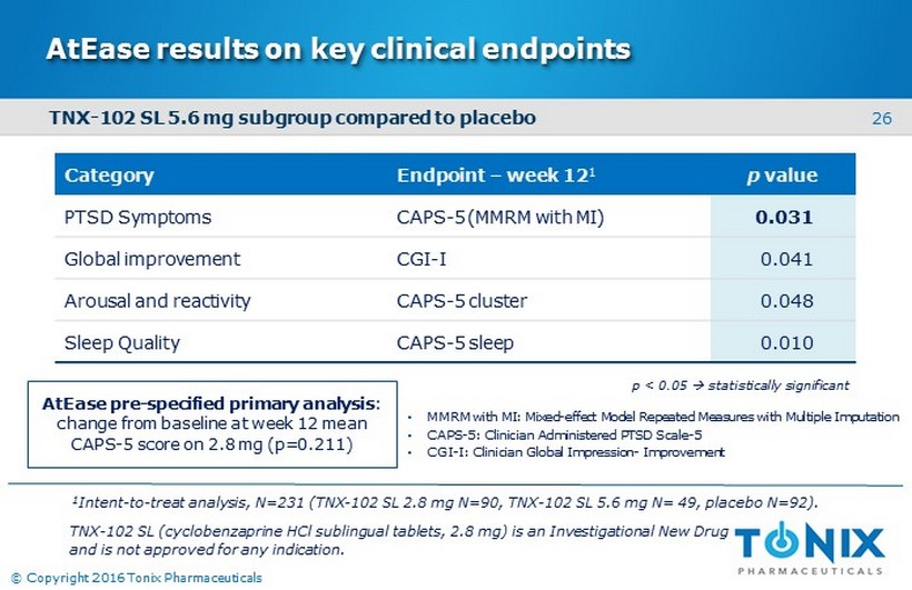 25 © Copyright 2016 Tonix Pharmaceuticals Phase 2 AtEase study of TNX - 102 SL in PTSD • AtEase Study ‒ Randomized , double - blind, placebo - controlled trial ‒ DSM - 5 diagnostic criteria for PTSD ‒ 231 participants studied 2:1:2 at 25 U.S. sites ‒ 1 x TNX - 102 SL 2.8 mg: 2 x TNX - 102 SL 2.8 mg: placebo ‒ Evaluated CAPS - 5 as primary endpoint ‒ Pre - specified primary analysis was 2.8 mg dose TNX - 102 SL (cyclobenzaprine HCl sublingual tablets, 2.8 mg) is an Investigational New Drug and is not approved for any indication.