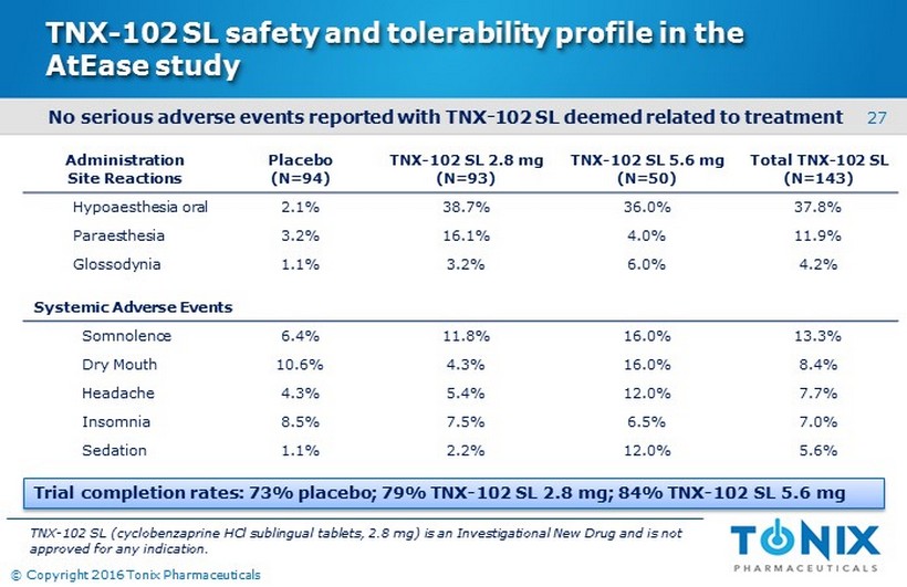 26 © Copyright 2016 Tonix Pharmaceuticals AtEase results on key clinical endpoints Category Endpoint – week 12 1 p value PTSD Symptoms CAPS - 5 (MMRM with MI) 0.031 Global improvement CGI - I 0.041 Arousal and reactivity CAPS - 5 cluster 0.048 Sleep Quality CAPS - 5 sleep 0.010 TNX - 102 SL (cyclobenzaprine HCl sublingual tablets, 2.8 mg) is an Investigational New Drug and is not approved for any indication. AtEase pre - specified primary analysis : change from baseline at week 12 mean CAPS - 5 score on 2.8 mg ( p=0.211) • MMRM with MI: Mixed - effect Model Repeated Measures with Multiple Imputation • CAPS - 5: Clinician Administered PTSD Scale - 5 • C GI - I: Clinician Global Impression - Improvement p < 0.05 statistically significant 1 Intent - to - treat analysis, N=231 (TNX - 102 SL 2.8 mg N=90, TNX - 102 SL 5.6 mg N= 49, placebo N=92). TNX - 102 SL 5.6 mg subgroup compared to placebo