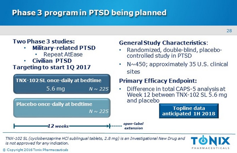 27 © Copyright 2016 Tonix Pharmaceuticals TNX - 102 SL safety and tolerability profile in the AtEase study No serious adverse events reported with TNX - 102 SL deemed related to treatment TNX - 102 SL (cyclobenzaprine HCl sublingual tablets, 2.8 mg) is an Investigational New Drug and is not approved for any indication. Administration Site Reactions Placebo ( N=94) TNX - 102 SL 2.8 mg ( N=93) TNX - 102 SL 5.6 mg (N=50) Total TNX - 102 SL ( N=143) Hypoaesthesia oral 2.1% 38.7% 36.0% 37.8% Paraesthesia 3.2% 16.1% 4.0% 11.9% Glossodynia 1.1% 3.2% 6.0% 4.2% Systemic Adverse Events Somnolence 6.4% 11.8% 16.0% 13.3% Dry Mouth 10.6% 4.3% 16.0% 8.4% Headache 4.3% 5.4% 12.0% 7.7% Insomnia 8.5% 7.5% 6.5% 7.0% Sedation 1.1% 2.2% 12.0% 5.6% Trial completion rates: 73% placebo; 79% TNX - 102 SL 2.8 mg; 84% TNX - 102 SL 5.6 mg