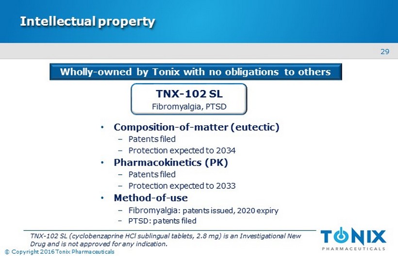 28 © Copyright 2016 Tonix Pharmaceuticals Phase 3 program in PTSD being planned General Study Characteristics : • Randomized , double - blind, placebo - controlled study in PTSD • N~450 ; approximately 35 U.S. clinical sites Primary Efficacy E ndpoint : • Difference in total CAPS - 5 analysis at Week 12 between TNX - 102 SL 5.6 mg and placebo Placebo once - daily at bedtime 12 weeks TNX - 102 SL once - daily at bedtime N ~ 225 N ~ 225 5.6 mg open - label extension TNX - 102 SL (cyclobenzaprine HCl sublingual tablets, 2.8 mg) is an Investigational New Drug and is not approved for any indication. Topline data anticipated 1H 2018 Two Phase 3 studies: • Military - related PTSD • R epeat AtEase • C ivilian PTSD Targeting to start 1Q 2017