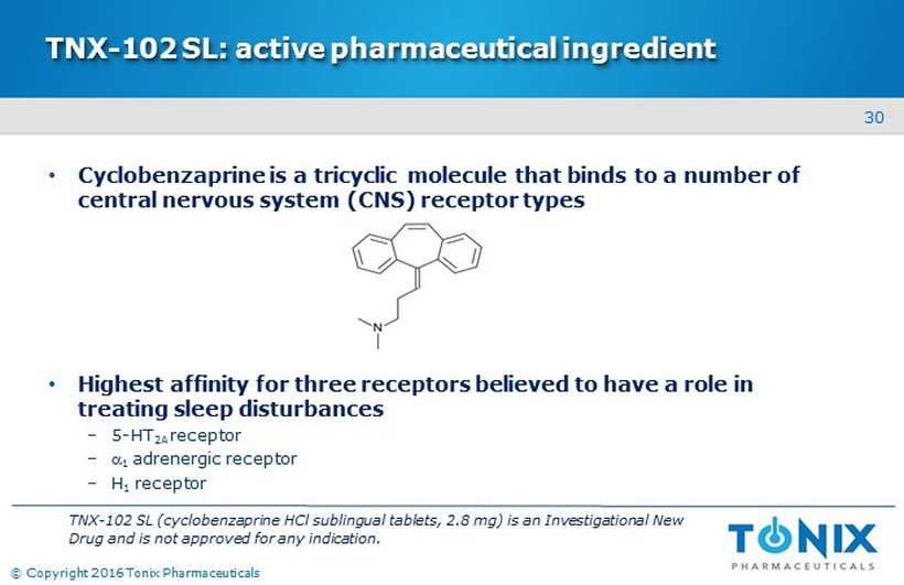 29 © Copyright 2016 Tonix Pharmaceuticals Intellectual property • Composition - of - matter (eutectic) ‒ Patents filed ‒ Protection expected to 2034 • Pharmacokinetics (PK) ‒ Patents filed ‒ Protection expected to 2033 • Method - of - use ‒ Fibromyalgia : patents issued, 2020 expiry ‒ PTSD: patents filed TNX - 102 SL Fibromyalgia , PTSD Wholly - owned by Tonix with no obligations to others TNX - 102 SL (cyclobenzaprine HCl sublingual tablets, 2.8 mg) is an Investigational New Drug and is not approved for any indication.