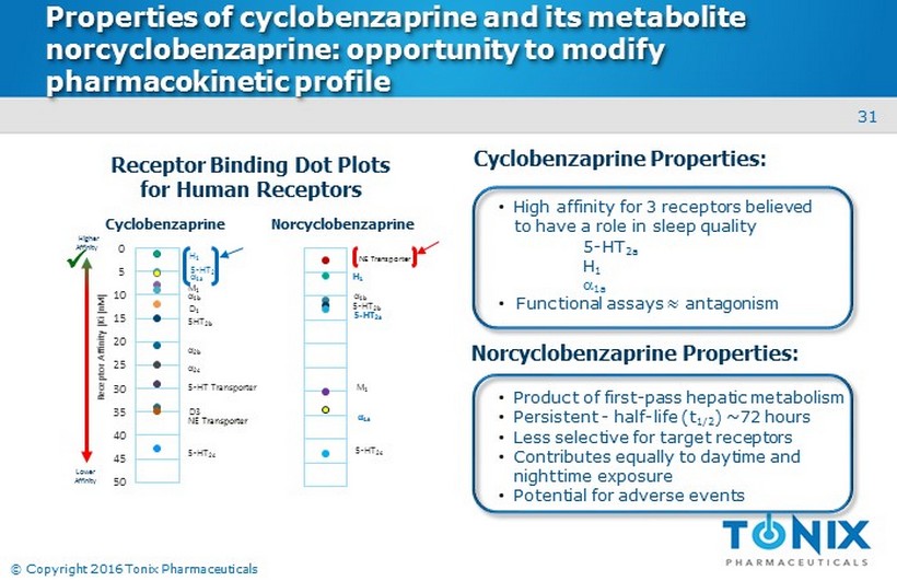 30 © Copyright 2016 Tonix Pharmaceuticals TNX - 102 SL: a ctive pharmaceutical i ngredient • Cyclobenzaprine is a tricyclic molecule that binds to a number of central nervous system (CNS) receptor types • Highest affinity for three receptors believed to have a role in treating sleep disturbances ‒ 5 - HT 2A receptor ‒ a 1 adrenergic receptor ‒ H 1 receptor TNX - 102 SL (cyclobenzaprine HCl sublingual tablets, 2.8 mg) is an Investigational New Drug and is not approved for any indication.