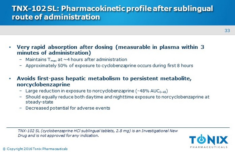 32 © Copyright 2016 Tonix Pharmaceuticals Cyclobenzaprine is detected in plasma within minutes following sublingual TNX - 102 SL Plasma Concentration Versus Time of TNX - 102 SL Compared to oral Cyclobenzaprine IR 0 0.5 1.0 1.5 Concentration (ng/L) 2500 1500 1000 500 2000 0 TNX - 102 SL 2.8 mg (sublingual) Cyclobenzaprine IR 5 mg (oral) Time (h) Source: U.S. Patent applications 13/918,692 – Transmucosal absorption. TNX - 102 SL (cyclobenzaprine HCl sublingual tablets, 2.8 mg) is an Investigational New Drug and is not approved for any indication.