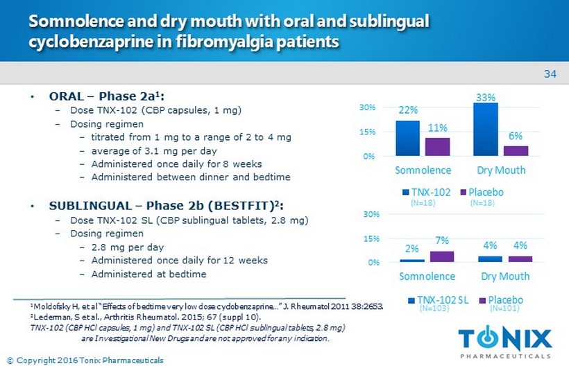 33 © Copyright 2016 Tonix Pharmaceuticals TNX - 102 SL: Pharmacokinetic profile after sublingual route of administration • Very rapid absorption after dosing (measurable in plasma within 3 minutes of administration) ‒ Maintains T max at ~4 hours after administration ‒ Approximately 50% of exposure to cyclobenzaprine occurs during first 8 hours • Avoids first - pass hepatic metabolism to persistent metabolite, norcyclobenzaprine ‒ Large reduction in exposure to norcyclobenzaprine ( - 48% AUC 0 - 48 ) ‒ Should equally reduce both daytime and nighttime exposure to norcyclobenzaprine at steady - state ‒ Decreased potential for adverse events TNX - 102 SL (cyclobenzaprine HCl sublingual tablets, 2.8 mg) is an Investigational New Drug and is not approved for any indication.