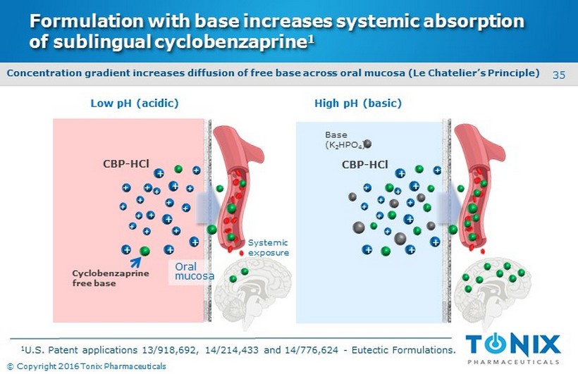 35 © Copyright 2016 Tonix Pharmaceuticals Formulation with base increases systemic absorption of sublingual cyclobenzaprine 1 Concentration gradient increases diffusion of free base across oral mucosa (Le Chatelier’s Principle) CBP - HCl Cyclobenzaprine free base Oral mucosa CBP - HCl Low pH (acidic) High pH (basic) Systemic exposure Base (K 2 HPO 4 ) + + + + + + + + + + + + + + + + + + + + + + + + + + +f + + + + + + + 1 U.S. Patent applications 13/918,692, 14/214,433 and 14/776,624 - Eutectic Formulations.