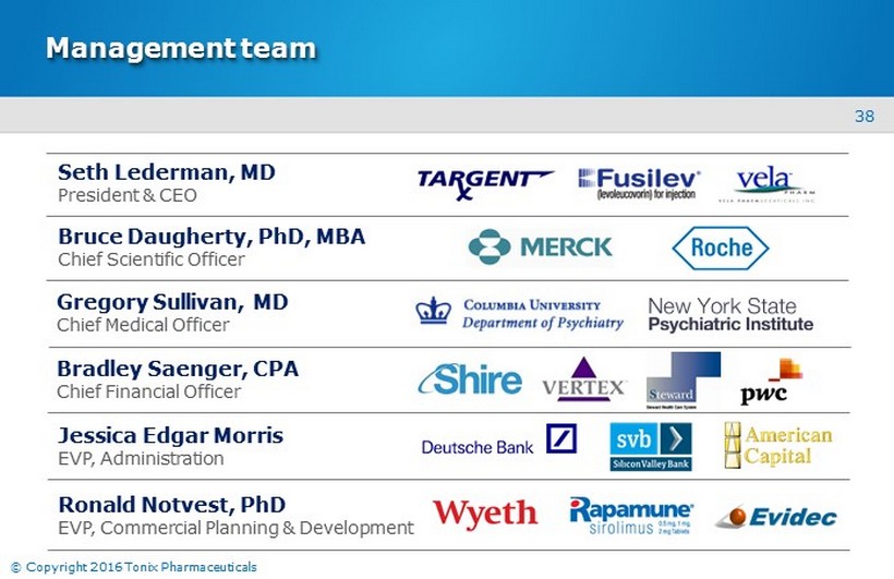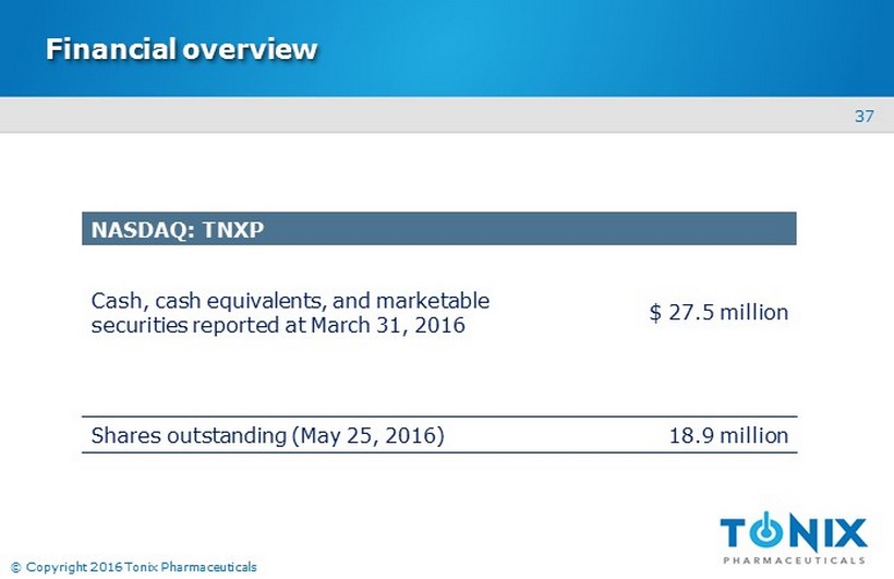 37 © Copyright 2016 Tonix Pharmaceuticals Financial overview NASDAQ: TNXP Cash, cash equivalents, and marketable securities reported at March 31, 2016 $ 27.5 million Shares outstanding (May 25, 2016) 18.9 million