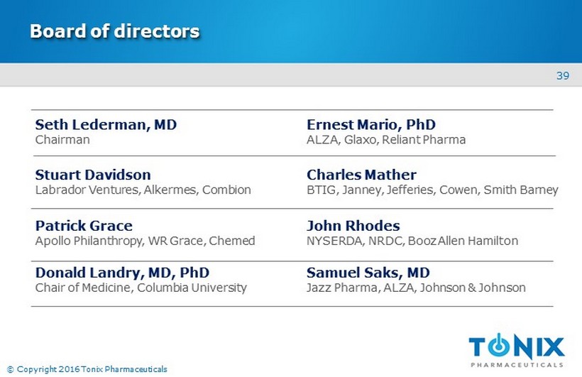 38 © Copyright 2016 Tonix Pharmaceuticals Management team Seth Lederman, MD President & CEO Jessica Edgar Morris EVP, Administration Bruce Daugherty, PhD, MBA Chief Scientific Officer Ronald Notvest, PhD EVP, Commercial Planning & Development Gregory Sullivan, MD Chief Medical Officer Bradley Saenger, CPA Chief Financial Officer