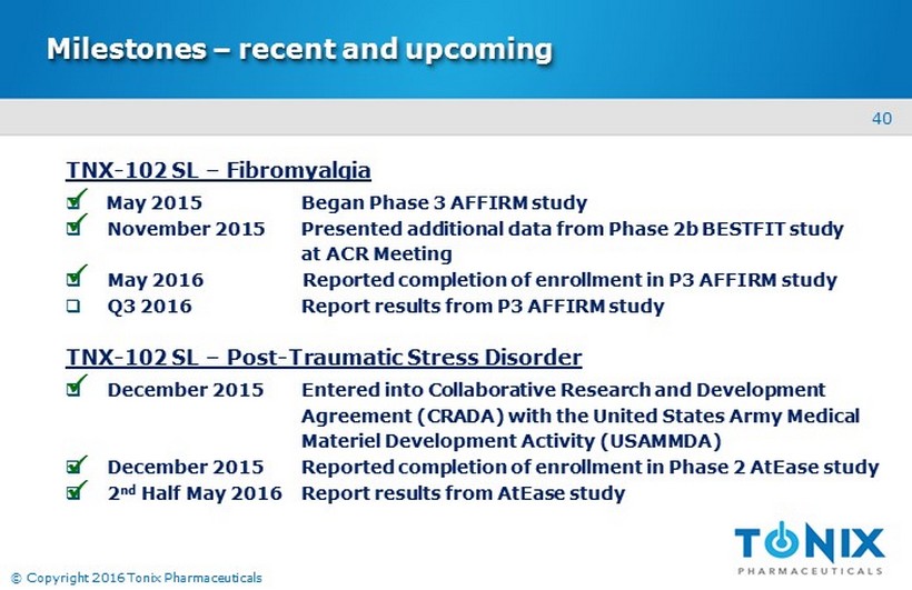 39 © Copyright 2016 Tonix Pharmaceuticals Board of directors Seth Lederman, MD Chairman Ernest Mario, PhD ALZA, Glaxo, Reliant Pharma John Rhodes NYSERDA, NRDC, Booz Allen Hamilton Samuel Saks, MD Jazz Pharma, ALZA, Johnson & Johnson Charles Mather BTIG, Janney, Jefferies, Cowen, Smith Barney Stuart Davidson Labrador Ventures, Alkermes , Combion Patrick Grace Apollo Philanthropy, WR Grace, Chemed Donald Landry, MD, PhD Chair of Medicine, Columbia University