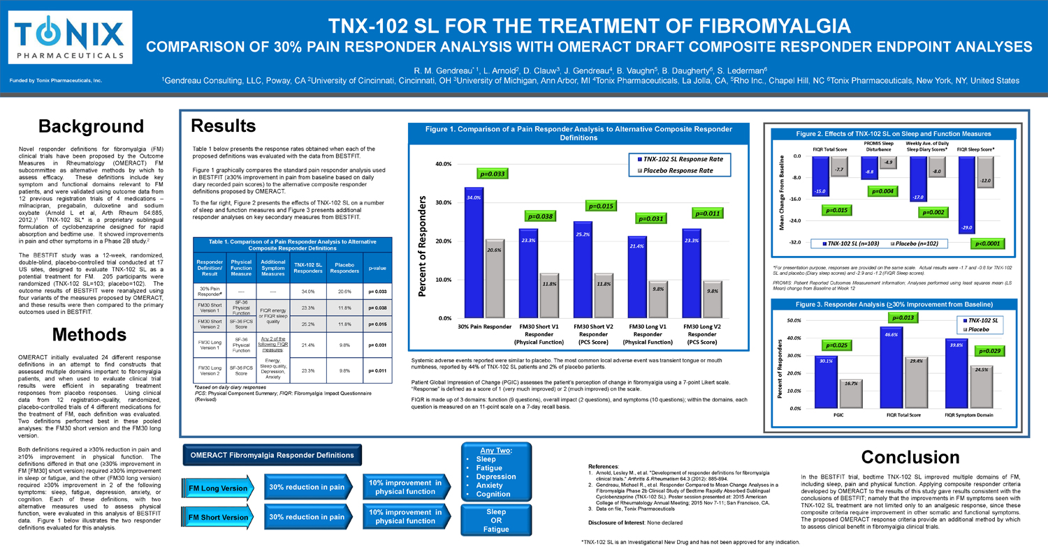 Table 1. Comparison of a Pain Responder Analysis to Alternative Composite Responder Definitions Responder Definition/ Result Physical Function Measure Additional Symptom Measures TNX - 102 SL Responders Placebo Responders p - value 30% Pain Responder # ---- ---- 34.0% 20.6% p= 0.033 FM30 Short Version 1 SF - 36 Physical Function FIQR energy or FIQR sleep quality 23.3% 11.8% p= 0.038 FM30 Short Version 2 SF - 36 PCS Score 25.2% 11.8% p= 0.015 FM30 Long Version 1 SF - 36 Physical Function Any 2 of the following FIQR measures : Energy, Sleep quality, Depression, Anxiety 21.4% 9.8% p= 0.031 FM30 Long Version 2 SF - 36 P CS Score 23.3% 9.8% p= 0.011 # based on daily diary responses PCS : Physical Component Summary; FIQR : Fibromyalgia Impact Questionnaire (Revised) Background Novel responder definitions for fibromyalgia (FM) clinical trials have been proposed by the Outcome Measures in Rheumatology (OMERACT) FM subcommittee as alternative methods by which to assess efficacy . These definitions include key symptom and functional domains relevant to FM patients, and were validated using outcome data from 12 previous registration trials of 4 medications – milnacipran , pregabalin , duloxetine and sodium oxybate (Arnold L et al, Arth Rheum 64 : 885 , 2012 . ) 1 TNX - 102 SL* is a proprietary sublingual formulation of cyclobenzaprine designed for rapid absorption and bedtime use . It showed improvements in pain and other symptoms in a Phase 2 B study . 2 The BESTFIT study was a 12 - week, randomized, double - blind, placebo - controlled trial conducted at 17 US sites, designed to evaluate TNX - 102 SL as a potential treatment for FM . 205 participants were randomized (TNX - 102 SL= 103 ; placebo= 102 ) . The outcome results of BESTFIT were reanalyzed using four variants of the measures proposed by OMERACT, and these results were then compared to the primary outcomes used in BESTFIT . R. M. Gendreau * 1 , L. Arnold 2 , D. Clauw 3 , J. Gendreau 4 , B. Vaughn 5 , B. Daugherty 6 , S. Lederman 6 1 Gendreau Consulting, LLC, Poway, CA 2 University of Cincinnati, Cincinnati, OH 3 University of Michigan, Ann Arbor, MI 4 Tonix Pharmaceuticals, La Jolla, CA, 5 Rho Inc., Chapel Hill, NC 6 Tonix Pharmaceuticals, New York, NY, United States TNX - 102 SL FOR THE TREATMENT OF FIBROMYALGIA COMPARISON OF 30% PAIN RESPONDER ANALYSIS WITH OMERACT DRAFT COMPOSITE RESPONDER ENDPOINT ANALYSES Funded by Tonix Pharmaceuticals, Inc. 34% 9.8% Conclusion In the BESTFIT trial, bedtime TNX - 102 SL improved multiple domains of FM, including sleep, pain and physical function . Applying composite responder criteria developed by OMERACT to the results of this study gave results consistent with the conclusions of BESTFIT ; namely that the improvements in FM symptoms seen with TNX - 102 SL treatment are not limited only to an analgesic response, since these composite criteria require improvement in other somatic and functional symptoms . The proposed OMERACT response criteria provide an additional method by which to assess clinical benefit in fibromyalgia clinical trials . References : 1. Arnold, Lesley M., et al. "Development of responder definitions for fibromyalgia clinical trials." Arthritis & Rheumatism 64.3 (2012): 885 - 894. 2. Gendreau, Michael R., et al. Responder Compared to Mean Change Analyses in a Fibromyalgia Phase 2b Clinical Study of Bedtime Rapidly Absorbed Sublingual Cyclobenzaprine (TNX - 102 SL). Poster session presented at: 2015 American College of Rheumatology Annual Meeting; 2015 Nov 7 - 11; San Francisco, CA. 3. Data on file, Tonix Pharmaceuticals Disclosure of Interest : None declared *TNX - 102 SL is an Investigational New Drug and has not been approved for any indication . Table 1 below presents the response rates obtained when each of the proposed definitions was evaluated with the data from BESTFIT. Figure 1 graphically compares the standard pain responder analysis used in BESTFIT (≥30% improvement in pain from baseline based on daily diary recorded pain scores) to the alternative composite responder definitions proposed by OMERACT. To the far right, Figure 2 presents the effects of TNX - 102 SL on a number of sleep and function measures and Figure 3 presents additional responder analyses on key secondary measures from BESTFIT. Results Methods OMERACT initially evaluated 24 different response definitions in an attempt to find constructs that assessed multiple domains important to fibromyalgia patients, and when used to evaluate clinical trial results were efficient in separating treatment responses from placebo responses . Using clinical data from 12 registration - quality, randomized, placebo - controlled trials of 4 different medications for the treatment of FM, each definition was evaluated . Two definitions performed best in these pooled analyses : the FM 30 short version and the FM 30 long version . Both definitions required a ≥ 30 % reduction in pain and ≥ 10 % improvement in physical function . The definitions differed in that one (≥ 30 % improvement in FM [FM 30 ] short version) required ≥ 30 % improvement in sleep or fatigue, and the other (FM 30 long version) required ≥ 30 % improvement in 2 of the following symptoms : sleep, fatigue, depression, anxiety, or cognition . Each of these definitions, with two alternative measures used to assess physical function, were evaluated in this analysis of BESTFIT data . Figure 1 below illustrates the two responder definitions evaluated for this analysis . 30% reduction in pain Sleep OR Fatigue Any Two : • Sleep • Fatigue • Depression • Anxiety • Cognition OMERACT Fibromyalgia Responder Definitions 34.0% 23.3% 25.2% 21.4% 23.3% 20.6% 11.8% 11.8% 9.8% 9.8% 0.0% 10.0% 20.0% 30.0% 40.0% 30% Pain Responder FM30 Short V1 Responder (Physical Function) FM30 Short V2 Responder (PCS Score) FM30 Long V1 Responder (Physical Function) FM30 Long V2 Responder (PCS Score) Percent of Responders TNX-102 SL Response Rate Placebo Response Rate p=0.033