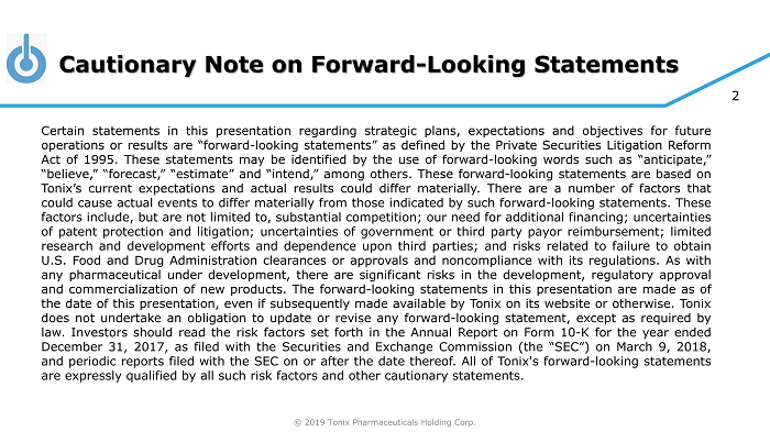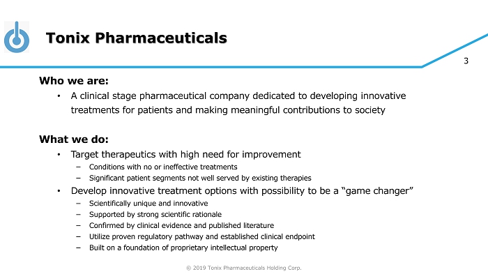 © 2019 Tonix Pharmaceuticals Holding Corp. 2 Cautionary Note on Forward - Looking Statements Certain statements in this presentation regarding strategic plans, expectations and objectives for future operations or results are “forward - looking statements” as defined by the Private Securities Litigation Reform Act of 1995 . These statements may be identified by the use of forward - looking words such as “anticipate,” “believe,” “forecast,” “estimate” and “intend,” among others . These forward - looking statements are based on Tonix’s current expectations and actual results could differ materially . There are a number of factors that could cause actual events to differ materially from those indicated by such forward - looking statements . These factors include, but are not limited to, substantial competition ; our need for additional financing ; uncertainties of patent protection and litigation ; uncertainties of government or third party payor reimbursement ; limited research and development efforts and dependence upon third parties ; and risks related to failure to obtain U . S . Food and Drug Administration clearances or approvals and noncompliance with its regulations . As with any pharmaceutical under development, there are significant risks in the development, regulatory approval and commercialization of new products . The forward - looking statements in this presentation are made as of the date of this presentation, even if subsequently made available by Tonix on its website or otherwise . Tonix does not undertake an obligation to update or revise any forward - looking statement, except as required by law . Investors should read the risk factors set forth in the Annual Report on Form 10 - K for the year ended December 31 , 2017 , as filed with the Securities and Exchange Commission (the “SEC”) on March 9 , 2018 , and periodic reports filed with the SEC on or after the date thereof . All of Tonix's forward - looking statements are expressly qualified by all such risk factors and other cautionary statements .