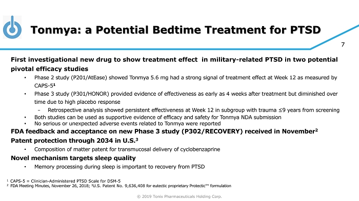 © 2019 Tonix Pharmaceuticals Holding Corp. 6 Candidates in Development Preclinical Phase 2 NDA 1 /BLA 2 Market Pipeline Product Indication Phase 3 TNX - 102 SL Bedtime Treatment for PTSD – Tonmya ® Daytime Treatment for PTSD TNX - 601 Novel polymorph and salt discovered and characterized; Preliminary human PK and safety data 3 from selected formulation expected 2H2019 TNX - 801 Horsepox virus synthesized and demonstrated protective vaccine activity in mice Smallpox - preventing vaccine Cyclobenzaprine HCl sublingual tablets Tianeptine oxalate oral formulation Live horsepox virus (HPXV) vaccine from cell culture Phase 1 1 NDA - New Drug Application; 2 BLA – Biologic Licensing Application; 3 non - IND study Bedtime Treatment for Agitation in Alzheimer’s All programs owned outright with no royalties due P302/ RECOVERY study to start 1Q2019 Bedtime Treatment for Fibromyalgia Phase 2 and 3 completed at 2.8 mg Treatment of Neurocognitive Dysfunction from Corticosteroids Fast Track Phase 2/3 ready program