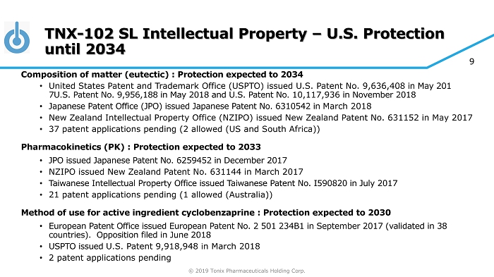 © 2019 Tonix Pharmaceuticals Holding Corp. 8 No Recognized Abuse Potential in Clinical Studies Active ingredient is cyclobenzaprine, which is structurally related to tricyclic antidepressants • Cyclobenzaprine interacts with receptors that regulate sleep quality: 5 - HT 2A, a 1 - adrenergic and histamine H 1 receptors • Cyclobenzaprine does NOT interact with the same receptors as traditional hypnotic sleep drugs, benzodiazepines or non - benzodiazepines that are associated with retrograde amnesia • Cyclobenzaprine - containing product was approved 40 years ago and current labeling (May 2016) indicates no abuse or dependence concern Tonmya NDA can be filed without drug abuse and dependency assessment studies • Discussed at March 9, 2017 m eeting with the FDA