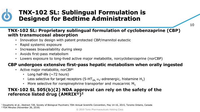 © 2019 Tonix Pharmaceuticals Holding Corp. 9 TNX - 102 SL Intellectual Property – U.S. Protection until 2034 Composition of matter (eutectic) : Protection expected to 2034 • United States Patent and Trademark Office (USPTO) issued U.S. Patent No. 9,636,408 in May 201 7U.S. Patent No. 9,956,188 in May 2018 and U.S. Patent No. 10,117,936 in November 2018 • Japanese Patent Office (JPO) issued Japanese Patent No. 6310542 in March 2018 • New Zealand Intellectual Property Office (NZIPO) issued New Zealand Patent No. 631152 in May 2017 • 37 patent applications pending (2 allowed (US and South Africa)) Pharmacokinetics (PK) : Protection expected to 2033 • JPO issued Japanese Patent No. 6259452 in December 2017 • NZIPO issued New Zealand Patent No. 631144 in March 2017 • Taiwanese Intellectual Property Office issued Taiwanese Patent No. I590820 in July 2017 • 21 patent applications pending (1 allowed (Australia)) Method of use for active ingredient cyclobenzaprine : Protection expected to 2030 • European Patent Office issued European Patent No. 2 501 234B1 in September 2017 (validated in 38 countries). Opposition filed in June 2018 • USPTO issued U.S. Patent 9,918,948 in March 2018 • 2 patent applications pending