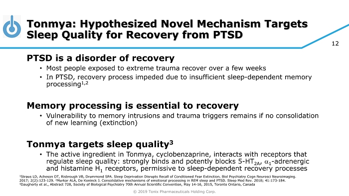 © 2019 Tonix Pharmaceuticals Holding Corp. 12 Tonmya: Hypothesized Novel Mechanism Targets Sleep Quality for Recovery from PTSD PTSD is a disorder of recovery • Most people exposed to extreme trauma recover over a few weeks • In PTSD, recovery process impeded due to insufficient sleep - dependent memory processing 1,2 Memory processing is essential to recovery • Vulnerability to memory intrusions and trauma triggers remains if no consolidation of new learning (extinction) Tonmya targets sleep quality 3 • The active ingredient in Tonmya, cyclobenzaprine, interacts with receptors that regulate sleep quality: strongly binds and potently blocks 5 - HT 2A , a 1 - adrenergic and histamine H 1 receptors, permissive to sleep - dependent recovery processes 1 Straus LD, Acheson DT, Risbrough VB, Drummond SPA. Sleep Deprivation Disrupts Recall of Conditioned Fear Extinction. Biol Psychiatry Cogn Neurosci Neuroimaging. 2017; 2(2):123 - 129. 2 Murkar ALA, De Koninck J. Consolidative mechanisms of emotional processing in REM sleep and PTSD. Sleep Med Rev. 2018; 41:173 - 184. 3 Daugherty et al., Abstract 728, Society of Biological Psychiatry 70th Annual Scientific Convention, May 14 - 16, 2015, Toronto Ont ario, Canada