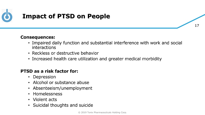 © 2019 Tonix Pharmaceuticals Holding Corp. 16 Overview of Posttraumatic Stress Disorder (PTSD) PSTD is a chronic disabling disorder in response to experiencing traumatic event(s) Symptoms of PTSD fall into four clusters: 1. Intrusion (aversive memories, nightmares, flashbacks) 2. Avoidance (avoiding persons, places or situations) 3. Mood/cognitions (memory block, emotional numbing, detachment from others) 4. Hyperarousal (anxiety, agitation & sleep disturbance) Diagnosis, symptom severity, as well as treatment effect, is determined by CAPS - 5* • Recognized as the standard for rating PTSD severity in clinical trials • Takes into account all four symptom clusters • Higher Total CAPS - 5 score reflects more severe PTSD symptoms * Clinician - administered PTSD scale for Diagnostic Statistical Manual version 5 (DSM - 5)