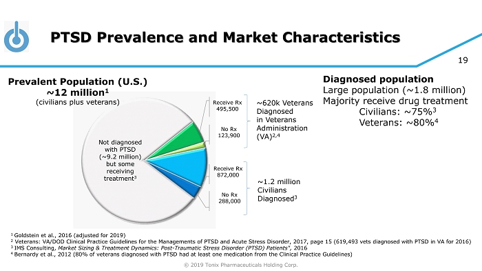 © 2019 Tonix Pharmaceuticals Holding Corp. 18 PTSD: U.S. Prevalence and Index Traumas PTSD is a chronic response to traumatic event(s) • A majority of people will experience a traumatic event at some point in their lifetime 1 • 20% of women and 8% of men in the U.S. who experience significant trauma develop PTSD 1 Adult Civilians: • Lifetime prevalence: 6.1% (14.4 million adults in the U.S.) 2 • Persistent - >1/3 fail to recover, even after several years following the trauma 2 • Twelve month prevalence: U.S. 4.7 % (12 million adults) 2 EU 2.3% (~10.0 million adults) 3 Most common forms of trauma 1 • Witnessing someone being badly injured or killed • Natural disaster • Life - threatening accident • Sexual or physical assault 1 Kessler et al., Arch Gen Psychiatry 1995; 52:1048 2 Goldstein et al., 2016 (adjusted for 2019) 3 The European Union Market Potential for a New PTSD Drug. Prepared for Tonix Pharmaceuticals by Procela Consultants Ltd, Sept emb er 2016