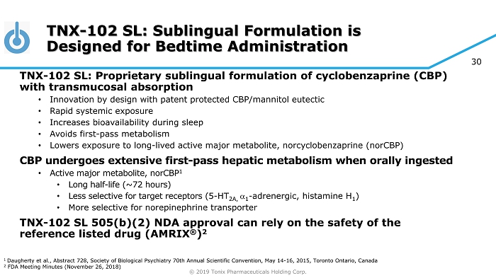 © 2019 Tonix Pharmaceuticals Holding Corp. 30 TNX - 102 SL: Sublingual Formulation is Designed for Bedtime Administration TNX - 102 SL: Proprietary sublingual formulation of cyclobenzaprine (CBP) with transmucosal absorption • Innovation by design with patent protected CBP/mannitol eutectic • Rapid systemic exposure • Increases bioavailability during sleep • Avoids first - pass metabolism • Lowers exposure to long - lived active major metabolite, norcyclobenzaprine ( norCBP ) CBP undergoes extensive first - pass hepatic metabolism when orally ingested • Active major metabolite, norCBP 1 • Long half - life (~72 hours) • Less selective for target receptors ( 5 - HT 2A, a 1 - adrenergic, histamine H 1 ) • More selective for norepinephrine transporter TNX - 102 SL 505(b)(2) NDA approval can rely on the safety of the reference listed drug (AMRIX ® ) 2 1 Daugherty et al., Abstract 728, Society of Biological Psychiatry 70th Annual Scientific Convention, May 14 - 16, 2015, Toronto Ont ario, Canada 2 FDA Meeting Minutes (November 26, 2018)