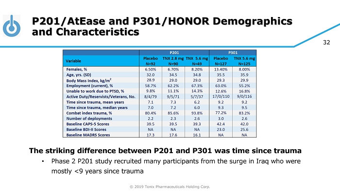 © 2019 Tonix Pharmaceuticals Holding Corp. 31 Differences Between P201/AtEase and P301/HONOR Studies Design Phase 2 and 3 studies were very similar – both studied military related PTSD at multiple sites in the US • CAPS - 5 ≥ 33 entry criteria used in Phase 3 BDI - II= Beck Depression Inventory - II; CGI - I=Clinical Global Impression – Improvement; MI= multiple imputation; MMRM=mixed model repeated measures; MADRS=Montgomery - Åsberg Depression Rating Scale; PROMIS SD=Patient - Reported Outcomes Measurement Information System – Sleep Disturbance; SDS=Sheehan Disability Scale; TFT=trauma - focused therapy
