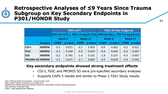 © 2019 Tonix Pharmaceuticals Holding Corp. BOLDED p - values are all p<0.05; BDI - II=Beck Depression CAPS - 5=Clinician - Administered PTSD Scale for DSM - 5; CGI - I=Clinical Global Impression – Improvement scale; mITT =modified Intent - to - Treat sample; MMRM=mixed model repeated measures analysis; MI=multiple imputation; PGIC=Patient Global Impre ssion of Change scale; PROMIS SD=Patient - Reported Outcome Measurement Information System Sleep Disturbance instrument (short form 8a); PBO=placebo; SDS=Sheeha n Disability Scale; TNX - 5.6=TNX - 102 SL 5.6 mg; yrs =years; 1 ° =primary; 2 ° s=secondaries Retrospective Analyses of ≤9 Years Since Trauma Subgroup on Primary and Secondary Endpoints in P301/HONOR Study Secondary endpoints also showed strong treatment effects in ≤9 yrs TST • Support CAPS - 5 results and similar to Phase 2 P201 Study results