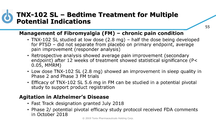 © 2019 Tonix Pharmaceuticals Holding Corp. 54 v Opportunities to Expand to Other Indications Growing recognition that there are many disorders where sleep disturbances may have a role in the pathophysiology (cardiovascular, metabolic, neurologic) • Homeostatic role of sleep quality in several disorders Psychiatric Disorders • Stress Disorders (PTSD) • Mood Disorders • Anxiety Disorders Chronic Pain States • Chronic wide - spread pain (fibromyalgia) • Osteoarthritis Role of sleep disturbance more established in common psychiatric and neurological/pain disorders • Recognized as a core symptom of many of these disorders • Traditional sleep medications, which increase sleep quantity, may not provide benefit (benzodiazepines in major depression) or are contraindicated (benzodiazepines in PTSD) v Psychiatric Symptoms of Neurological Disorders • Agitation in Alzheimer’s • Psychosis in Parkinson’s, Alzheimer’s and other dementias