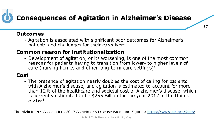 © 2019 Tonix Pharmaceuticals Holding Corp. 56 What is Agitation in Alzheimer’s Disease? Agitation is one of the most distressing and debilitating of the behavioral complications of Alzheimer’s disease • Includes emotional lability, restlessness, irritability and aggression 1 Link between disturbed sleep and agitation in Alzheimer’s 1 - 3 • Agitation is commonly diurnal (“ sundowning ”) Prevalence • Agitation is likely to affect more than half of the 5.3 million Americans who currently suffer from moderate to severe Alzheimer’s disease, and this number is expected to nearly triple by 2050 4 1 Rose, K.et al. (2015). American Journal of Alzheimer's Disease & Other Dementias , 30 :78 2 Shih, Y. H., et al. (2017). Journal of the American Medical Directors Association , 18 , 396. 3 Canevelli, M., et al. (2016). Frontiers in medicine , 3 . 4 The Alzheimer’s Association, 2017 Alzheimer’s Disease Facts and Figures: https://www.alz.org/facts/
