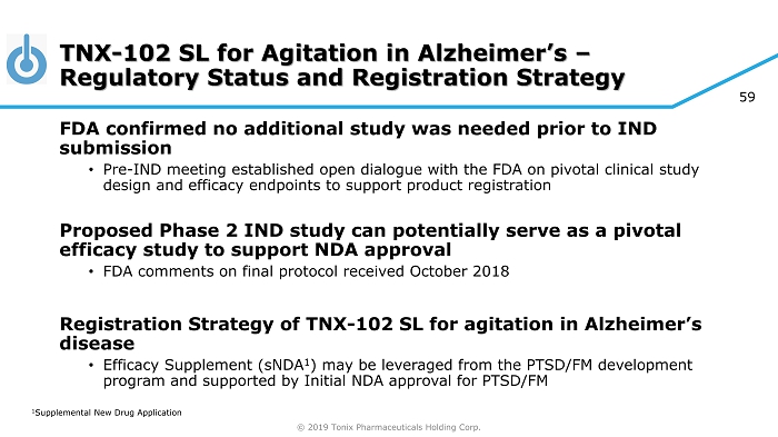 © 2019 Tonix Pharmaceuticals Holding Corp. 58 Agitation in Alzheimer’s Disease – Additional Indication Being Developed for TNX - 102 SL FDA designated Fast Track development program Significant unmet need • No FDA approved drugs for the treatment of agitation in Alzheimer’s Mechanism of improving sleep quality • Sleep disturbance is a significant and common symptoms in Alzheimer’s Pharmacological advantages outweigh potential concerns of using TNX - 102 SL in treating agitation in Alzheimer’s disease • Blocks 3 receptors, not just one (e.g., 5 - HT 2A )