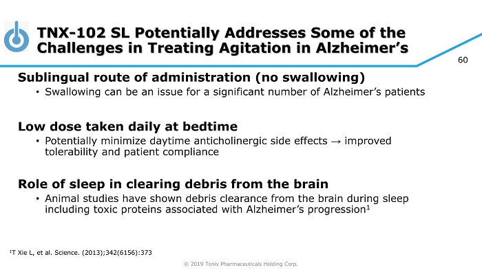 © 2019 Tonix Pharmaceuticals Holding Corp. 59 TNX - 102 SL for Agitation in Alzheimer’s – Regulatory Status and Registration Strategy FDA confirmed no additional study was needed prior to IND submission • Pre - IND meeting established open dialogue with the FDA on pivotal clinical study design and efficacy endpoints to support product registration Proposed Phase 2 IND study can potentially serve as a pivotal efficacy study to support NDA approval • FDA comments on final protocol received October 2018 Registration Strategy of TNX - 102 SL for agitation in Alzheimer’s disease • Efficacy Supplement (sNDA 1 ) may be leveraged from the PTSD/FM development program and supported by Initial NDA approval for PTSD/FM 1 Supplemental New Drug Application
