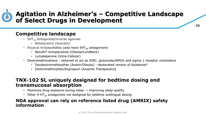 © 2019 Tonix Pharmaceuticals Holding Corp. 65 Sleep – Wake Cycles Alter Permeability of the CSF – Brain Barrier Fluid exchange at the CSF – brain barrier allows for clearance of toxic proteins called β – amyloids (A β ). 1 Glial cells in the brain work to facilitate this fluid exchange. 2 Sleep – wake cycles alter glial cell morphology, which may affect fluid exchange at the CSF – brain barrier. 3 Wakefulness: Fluid exchange is reduced due to limited permeability of the CSF – brain barrier 1 Sleep: Fluid exchange is increased due to greater permeability of the CSF – brain barrier 1 1. Xie L, et al. Science. 2013;342(6156):373 - 377. 3. Bellesi M, et al. BMC Biol. 2015;13:66. 2. Papadopoulos MC, et al. Nat Rev Neurosci. 2013;14(4):265 - 277. Ependyma (glial cells) Astrocytes (glial cells) Ependyma (glial cells) Astrocytes (glial cells)