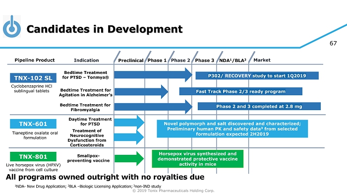 © 2019 Tonix Pharmaceuticals Holding Corp. 66 Agitation in Alzheimer’s – Competitive Landscape of Select Drugs in Development Competitive landscape • 5HT 2A Antagonists/inverse agonists • Nelotanserin ( Axovant ) • Atypical Antip sychotics (also have 5HT 2A antagonism) • Rexulti ® brexpiprazole (Otsuka/ Lundbeck ) • Lumateperone (Intra - Cellular ) • Dextromethorphans – believed to act as SSRI, glutamate/NMDA and sigma - 1 receptor modulators • Deudextromethorphan ( Avanir /Otsuka) - deuterated version of Nuedexta ® • Dextromethorphan/bupropion ( Axsome Therapeutics) TNX - 102 SL uniquely designed for bedtime dosing and transmucosal absorption • Maximize drug exposure during sleep → improving sleep quality • Other 5 - HT 2A antagonists not designed for bedtime sublingual dosing NDA approval can rely on reference listed drug (AMRIX) safety information