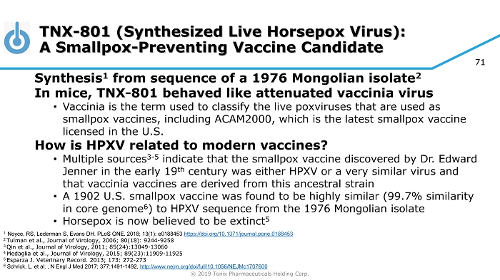 © 2019 Tonix Pharmaceuticals Holding Corp. 70 TNX - 801 (Synthesized Live Horsepox Virus): A Smallpox - Preventing Vaccine Candidate Pre - IND Stage Potential improvement over current biodefense tools against smallpox ✓ Leverages Tonix’s government affairs effort ✓ Collaboration with Professor David Evans and Dr. Ryan Noyce at University of Alberta ✓ Demonstrated protective vaccine activity in mice ✓ Patent application on novel vaccine submitted Regulatory strategy • We intend to meet with FDA to discuss the most efficient and appropriate investigational plan to support the licensure, either: ✓ Application of the “Animal Rule”, or ✓ Conducting an active comparator study using ACAM2000 • Good Manufacturing Practice (GMP) viral production process in development Targeting a Potential Public Health Issue Material threat medical countermeasure under 21 st Century Cures Act • Qualifies for Priority Review Voucher (PRV) upon licensure * ✓ PRVs have no expiration date, are transferrable and have sold for ~$125 M *BLA/NDA priority 6 - month review is expected.