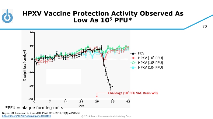 79 © 2019 Tonix Pharmaceuticals Holding Corp. PBS VACV WR (5x10 3 PFU) Dryvax clone (10 7 PFU) HPXV (10 7 PFU) Challenge (10 6 PFU VAC strain WR) Biological Properties of HPXV: Less Virulent than a Dryvax Clone, but Produces Protective Immunity Noyce, RS, Lederman S, Evans DH. PLoS ONE. 2018; 13(1): e0188453 https://doi.org/10.1371/journal.pone.0188453