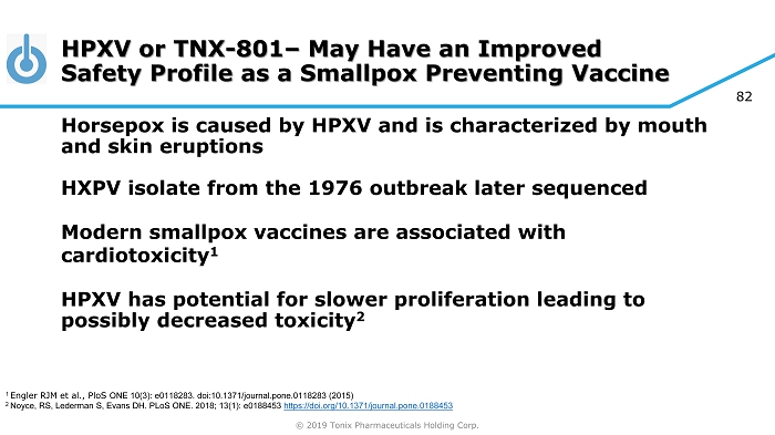 81 © 2019 Tonix Pharmaceuticals Holding Corp. No challenge PBS ➔ VACV (10 6 PFU) VACV* (5x10 3 PFU) ➔ VACV (10 6 PFU) HPXV (10 5 PFU) ➔ VACV (10 6 PFU) HPXV (10 6 PFU) ➔ VACV (10 6 PFU) HPXV (10 7 PFU) ➔ VACV (10 6 PFU) * VACV (strain WR) No Overt Clinical Sign Observed in HPXV Vaccinated Mice After VACV Challenge Noyce, RS, Lederman S, Evans DH. PLoS ONE. 2018; 13(1): e0188453 https://doi.org/10.1371/journal.pone.0188453