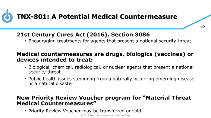 © 2019 Tonix Pharmaceuticals Holding Corp. 85 TNX - 801: A Potential Medical Countermeasure 21st Century Cures Act (2016), Section 3086 • Encouraging treatments for agents that present a national security threat Medical countermeasures are drugs, biologics (vaccines) or devices intended to treat: • Biological, chemical, radiological, or nuclear agents that present a national security threat • Public health issues stemming from a naturally occurring emerging disease or a natural disaster New Priority Review Voucher program for “Material Threat Medical Countermeasures” • Priority Review Voucher may be transferred or sold