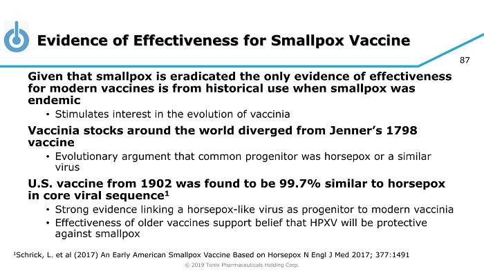 © 2019 Tonix Pharmaceuticals Holding Corp. 86 Live virus vaccines stimulate cross - reactive immunity • Protects from possible infection with smallpox virus • Renders recipient “immune” • Provides indirect protection to non - immunized population “herd immunity” Potential safety improvement over existing vaccines • Cardiotoxicity limits widespread smallpox vaccination in at - risk population Exclusivity • Patent application filed on novel virus composition • 12 years exclusivity can be anticipated Eligibility for Priority Review Voucher upon licensure if accepted as medical counter - measure Mechanism of Action Possible advantages of TNX - 801 TNX - 801 (HPVX) • Synthesized live horsepox virus • Shares structural characteristics with vaccinia - based smallpox vaccines • Unique properties that suggest lower toxicity TNX - 801 (Synthesized Live Horsepox Virus): A Smallpox - Preventing Vaccine Candidate