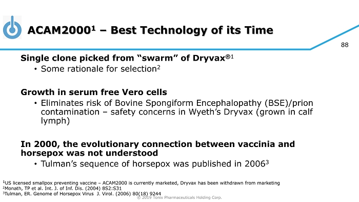 © 2019 Tonix Pharmaceuticals Holding Corp. 87 Given that smallpox is eradicated the only evidence of effectiveness for modern vaccines is from historical use when smallpox was endemic • Stimulates interest in the evolution of vaccinia Vaccinia stocks around the world diverged from Jenner’s 1798 vaccine • Evolutionary argument that common progenitor was horsepox or a similar virus U.S. vaccine from 1902 was found to be 99.7% similar to horsepox in core viral sequence 1 • Strong evidence linking a horsepox - like virus as progenitor to modern vaccinia • Effectiveness of older vaccines support belief that HPXV will be protective against smallpox Evidence of Effectiveness for Smallpox Vaccine 1 Schrick, L. et al (2017) An Early American Smallpox Vaccine Based on Horsepox N Engl J Med 2017; 377:1491