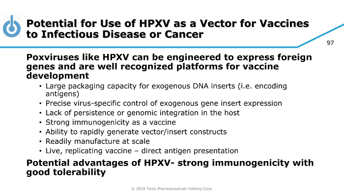 © 2019 Tonix Pharmaceuticals Holding Corp. 97 Potential for Use of HPXV as a Vector for Vaccines to Infectious Disease or Cancer Poxviruses like HPXV can be engineered to express foreign genes and are well recognized platforms for vaccine development • Large packaging capacity for exogenous DNA inserts (i.e. encoding antigens) • Precise virus - specific control of exogenous gene insert expression • Lack of persistence or genomic integration in the host • Strong immunogenicity as a vaccine • Ability to rapidly generate vector/insert constructs • Readily manufacture at scale • Live, replicating vaccine – direct antigen presentation Potential advantages of HPXV - strong immunogenicity with good tolerability