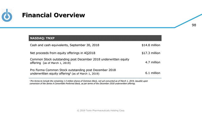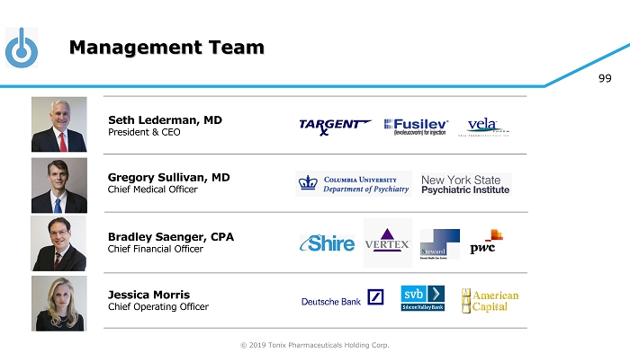 © 2019 Tonix Pharmaceuticals Holding Corp. 98 Financial Overview NASDAQ: TNXP Cash and cash equivalents, September 30, 2018 $14.8 million Net proceeds from equity offerings in 4Q2018 $17.3 million Common Stock outstanding post December 2018 underwritten equity offering ( a s of March 1, 2019) 4.7 million Pro Forma Common Stock outstanding post December 2018 underwritten equity offering 1 ( a s of March 1, 2019) 6.1 million 1 Pro forma to include the remaining 1.4 million shares of Common Stock, not yet converted as of March 1, 2019, issuable upon conversion of the Series A Convertible Preferred Stock, as per terms of the December 2018 underwritten offering.
