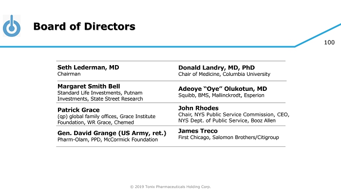 © 2019 Tonix Pharmaceuticals Holding Corp. 100 Board of Directors Seth Lederman, MD Chairman Adeoye “Oye” Olukotun, MD Squibb, BMS, Mallinckrodt, Esperion John Rhodes Chair, NYS Public Service Commission, CEO, NYS Dept. of Public Service, Booz Allen James Treco First Chicago, Salomon Brothers/Citigroup Gen. David Grange (US Army, ret.) Pharm - Olam, PPD, McCormick Foundation Patrick Grace ( qp ) global family offices, Grace Institute Foundation, WR Grace, Chemed Donald Landry, MD, PhD Chair of Medicine, Columbia University Margaret Smith Bell Standard Life Investments, Putnam Investments, State Street Research