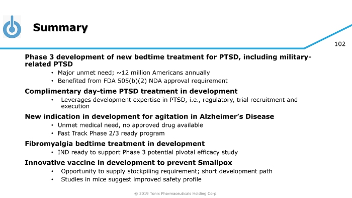 © 2019 Tonix Pharmaceuticals Holding Corp. 101 Milestones – Recently Completed and Upcoming □ July 201 8 Completed P301/HONOR study interim analysis - result did not support study continuation but strengthened new Phase 3 study □ August 201 8 Presentation of P301/HONOR study results at Military Health System Scientific Symposium □ October 201 8 Met with FDA and received preliminary agreement on the design of new Phase 3 study of Tonmya for PTSD (P302/RECOVERY study) □ November 201 8 Received FDA minutes confirming agreement on the design of P302/RECOVERY study □ First Quarter 2019 P302/RECOVERY study to be initiated □ First Quarter 2019 FM FDA Clinical Guidance meeting □ Second Half 2019 P reliminary human pharmacokinetic and safety data (non - IND study) from selected TNX - 601 (tianeptine oxalate) formulation expected □ First Half 2020 Topline data from P302/RECOVERY study expected x x x x