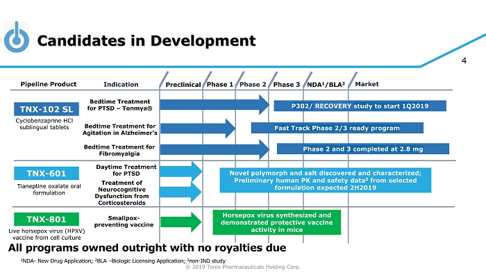 © 2019 Tonix Pharmaceuticals Holding Corp. 3 Posttraumatic Stress Disorder (PTSD) – Lead program; new bedtime treatment - Tonmya ®1 • P302/RECOVERY Phase 3 clinical study with Week 4 primary endpoint to initiate in 1Q2019 • Results from 2 efficacy studies improve the new Phase 3 study design New Phase • P302/RECOVERY study design features accepted by the FDA 2 A gitation in Alzheimer’s disease (AAD) • IND 3 ready to support Phase 2 potential pivotal efficacy study Fibromyalgia Syndrome (FM) • IND 3 ready to support Phase 3 potential pivotal efficacy study TNX - 601 4 – Daytime PTSD treatment and treatment of neurocognitive dysfunction from corticosteroids • Pre - IND candidate; nonclinical development ongoing TNX - 801 5 - Smallpox - preventing vaccine candidate • Efficacy demonstrated in mouse model 1 Tonmya has been conditionally accepted by the U.S. FDA as the proposed trade name for TNX - 102 SL (cyclobenzaprine HCl sublingual tablets) for the treatment of PTSD. TNX - 102 SL is an investigational new drug and has not been approved for any indication. 2 FDA Meeting Minutes (November 26, 2018) 3 IND - Investigational New Drug Application 4 T ianeptine oxalate 5 S ynthesized live horsepox virus Tonix Development Highlights TNX - 102 SL Cyclobenzaprine Sublingual Tablets Pipeline