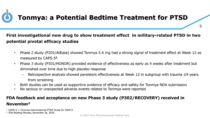 © 2019 Tonix Pharmaceuticals Holding Corp. 4 Candidates in Development Preclinical Phase 2 NDA 1 /BLA 2 Market Pipeline Product Indication Phase 3 TNX - 102 SL Bedtime Treatment for PTSD – Tonmya ® Daytime Treatment for PTSD TNX - 601 Novel polymorph and salt discovered and characterized; Preliminary human PK and safety data 3 from selected formulation expected 2H2019 TNX - 801 Horsepox virus synthesized and demonstrated protective vaccine activity in mice Smallpox - preventing vaccine Cyclobenzaprine HCl sublingual tablets Tianeptine oxalate oral formulation Live horsepox virus (HPXV) vaccine from cell culture Phase 1 1 NDA - New Drug Application; 2 BLA – Biologic Licensing Application; 3 non - IND study Bedtime Treatment for Agitation in Alzheimer’s All programs owned outright with no royalties due P302/ RECOVERY study to start 1Q2019 Bedtime Treatment for Fibromyalgia Phase 2 and 3 completed at 2.8 mg Treatment of Neurocognitive Dysfunction from Corticosteroids Fast Track Phase 2/3 ready program