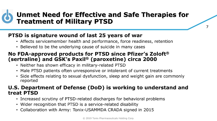 © 2019 Tonix Pharmaceuticals Holding Corp. 6 Prevalence of PTSD Among Civilians and Veterans 1 Goldstein et al., 2016 (adjusted for 2019) ; 2 Norris, PTSD Res Quar . 2013; 3 Analysis of VA Health Care Utilization among Operation Enduring Freedom, Operation Iraqi Freedom, and Operation New Dawn Veterans, from 1st Qtr FY 2002 through 2nd Qtr FY 2015, Washington, DC ; Among 1.9M separated OEF/OIF/OND veterans, 1.2M have obtained VA healthcare; 685k evaluated by VA with possible mental disorder, and 379k diagnosed with PTSD. >19% Iraq/Afghanistan 3 4.7% Adult population 1 19 - 31% Vietnam veterans 2 12 million American adults annually 1 Women more likely to develop than men 1