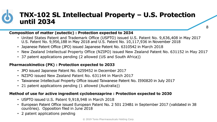 © 2019 Tonix Pharmaceuticals Holding Corp. 7 Unmet Need for Effective and Safe Therapies for Treatment of Military PTSD PTSD is signature wound of last 25 years of war • Affects servicemember health and performance, force readiness, retention • Believed to be the underlying cause of suicide in many cases No FDA - approved products for PTSD since Pfizer’s Zoloft ® (sertraline) and GSK’s Paxil ® (paroxetine) circa 2000 • Neither has shown efficacy in military - related PTSD • Male PTSD patients often unresponsive or intolerant of current treatments • Side effects relating to sexual dysfunction, sleep and weight gain are commonly reported U.S. Department of Defense (DoD) is working to understand and treat PTSD • Increased scrutiny of PTSD - related discharges for behavioral problems • Wider recognition that PTSD is a service - related disability • Collaboration with Army: Tonix - USAMMDA CRADA signed in 2015