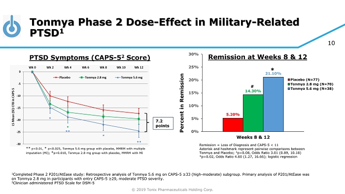 © 2019 Tonix Pharmaceuticals Holding Corp. 9 Potential Therapeutic Advantages of Tonmya Tonmya is believed to treat PTSD by improving sleep quality • The brain naturally processes memories during sleep • PTSD sufferers’ emotionally charged memories disturb sleep and disrupt the natural processing of memories during sleep • Tonmya is believed to normalize memory processing and facilitate extinction consolidation (breaking the link between “triggers” and PTSD symptoms) Tonmya is NEITHER a benzodiazepine nor a narcotic • The active ingredient of Tonmya , cyclobenzaprine, does NOT interact with the same receptors as traditional hypnotic sleep drugs associated with retrograde amnesia; is NOT an opiate Tonmya is non - addictive • Cyclobenzaprine is the active ingredient of an orally ingested immediate release tablet (Flexeril ® ), approved 40 years ago • Flexeril’s current labeling indicates no abuse and dependence concern at higher doses than Tonmya ( 15 - 30 mg/day v. 5.6 mg/day ); NDA can be filed without drug abuse and dependency assessment studies Once - daily sublingual dose taken at bedtime enhances patient adherence