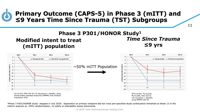 © 2019 Tonix Pharmaceuticals Holding Corp. 10 Tonmya Phase 2 Dose - Effect in Military - Related PTSD 1 1 Completed Phase 2 P201/AtEase study: Retrospective analysis of Tonmya 5.6 mg on CAPS - 5 ≥33 (high - moderate) subgroup. Primary analysis of P 201/AtEase was on Tonmya 2.8 mg in participants with entry CAPS - 5 ≥29 , moderate PTSD severity. 2 Clinician administered PTSD Scale for DSM - 5 7.2 points ** p<0.01, * p<0.025, Tonmya 5.6 mg group with placebo, MMRM with multiple imputation (MI); * p=0.018, Tonmya 2.8 mg group with placebo, MMRM with MI PTSD Symptoms (CAPS - 5 2 Score) Remission = Loss of Diagnosis and CAPS - 5 < 11 Asterisk and hashmark represent pairwise comparisons between Tonmya and Placebo; # p=0.08, Odds Ratio 3.01 (0.89, 10.18) *p=0.02, Odds Ratio 4.60 (1.27, 16.66); logistic regression 5.20% 14.30% 21.10% 0% 5% 10% 15% 20% 25% 30% Weeks 8 & 12 Percent in Remission Placebo (N=77) Tonmya 2.8 mg (N=70) Tonmya 5.6 mg (N=38) # * Remission at Weeks 8 & 12